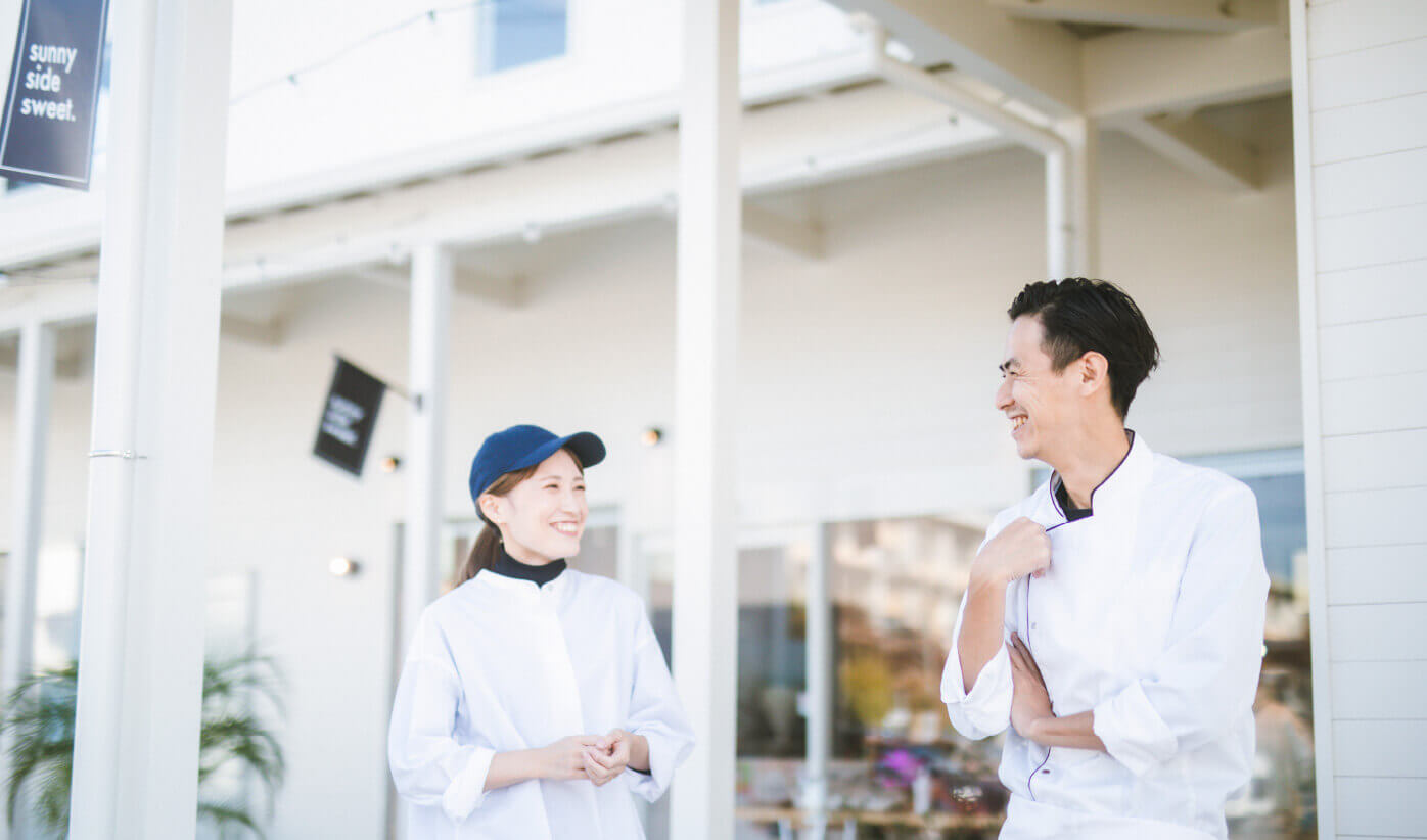 住宅地の中に佇む、南国の雰囲気を漂わせた白いおしゃれな店舗が、sunny side sweet.さんです。2022年8月にオープンしたばかりですが、すでに多くの地元の人たちに愛されている人気店。sunny side sweet.のオーナーの宮内 洋一郎さんは、もともとはイタリアンレストランを経営していました。「新型コロナウイルスの影響で、レストランが営業できない日が続き、事業転換せざるを得ませんでした。レストランも継続中ですが、お土産や贈答用などにも使いやすいスイーツの分野に進出することにしました。それが、Story of cheesecake.です。この店舗が軌道に乗り、さらにスイーツをたくさん取り扱うお店をオープンさせることにしました」。