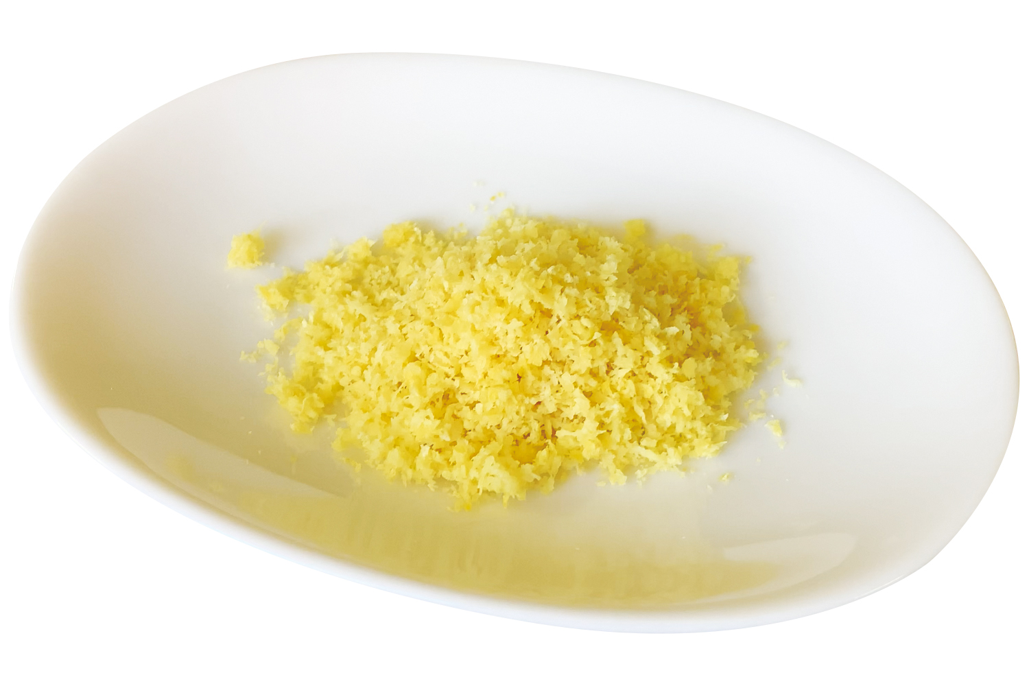 レモンの外皮を一度「りんごの皮」のようにむいてから、すりおろし加工を施しています。 チョッパーにかけたものと違い、風味がよく粒がしっかり残っています。