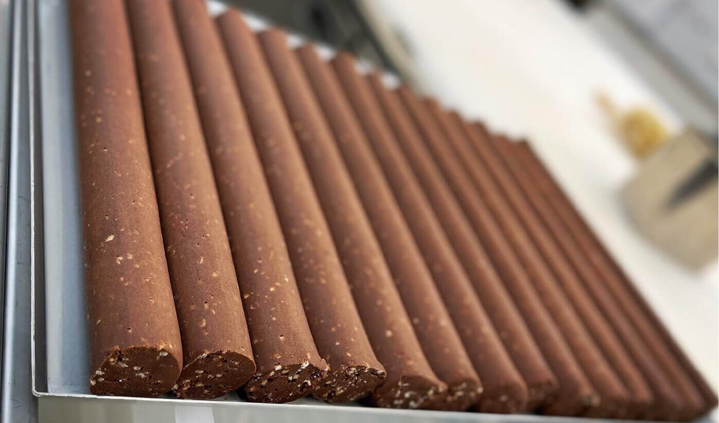 「クッキーは、生地・バターの温度によってが仕上がりが左右されます。成形時に人の手の熱が加わると生地がダレやすいので、生地に手の熱を伝えたくない。手粉が多いと配合や固さを変えてしまうし、生地にツヤが無くなってしまいます」この課題の解消にも一役買ったのが、当社の「ロングクッキー200型」でした。