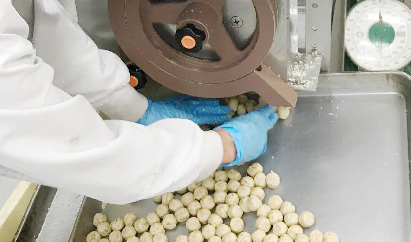 「オーガニック・ボールクッキー開発時に、丸形が一番効率的で、少人数でも生産量が増えると判断したのが導入理由です。それと掃除が簡単なのも導入の後押しとなりました」。「実際、機械を導入して2年程経過したころ、冬場商品としてブールドネージュ製造の依頼がありました。形状も丸形なのでチャレンジしたところ大ヒット商品となっています」と代表の道窪