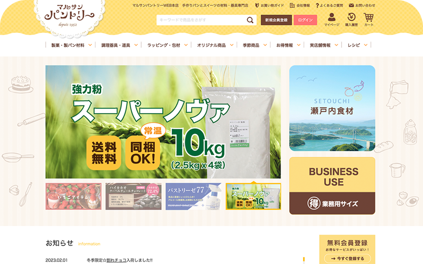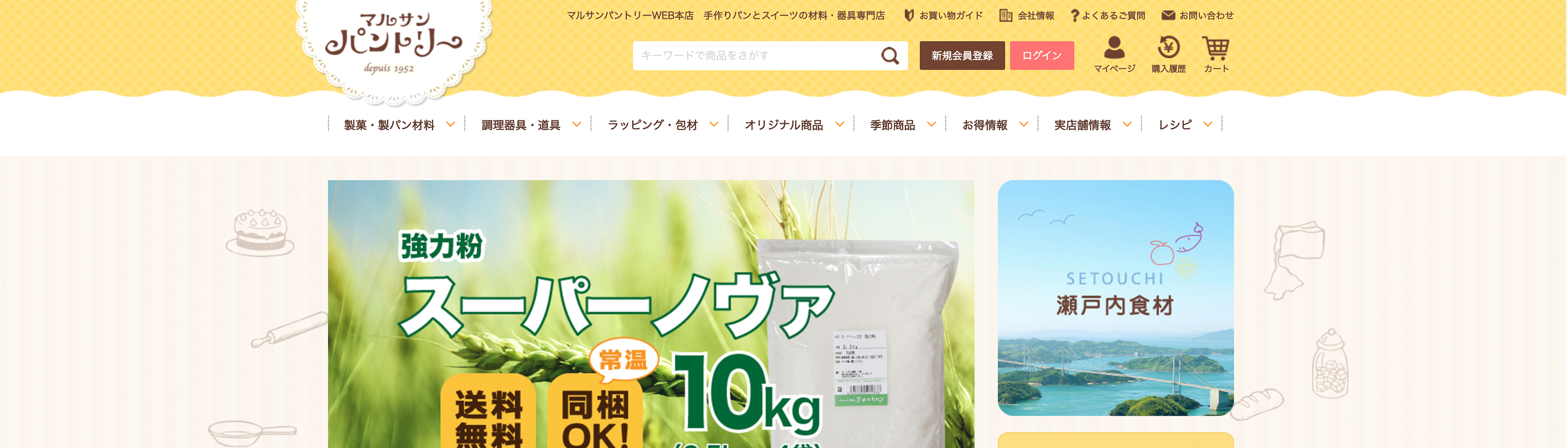 マルサンパントリーは、ご家庭でのお菓子・パン作りの食材が揃ったお店です。プロのケーキ屋さんやパン屋さんが使用する業務用食材を使いやすいサイズで販売しています。
